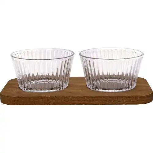 Lasikulho setti, jossa puinen alusta. Pienet ” naposteltavat ” löytävät paikkansa näistä lasikulhoista. Sopii myös tomaattien ja kurkkuviipaleiden tarjoiluun. Kulhot ovat irrallisia ja voidaan käyttää myös erillään.