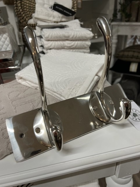 Pieni, hopeanvärinen naulakko, sopii niin päällysvaatteille kuin kylpytakeille.
